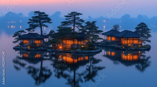 © AGUNG, Fototapeta premium Illuminated island houses on tranquil lake at dusk.