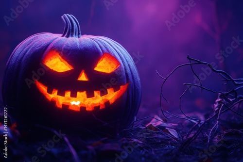 Fototapeta premium Illuminated jack o lantern with a spooky smile in a dark purple halloween...