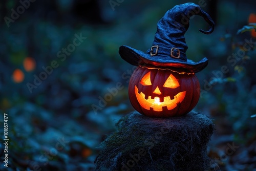 Naklejka premium Illuminated Jack-O'-Lantern with Witch's Hat in Dark Woods