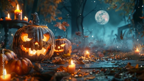 © Lush Diaries, Naklejka premium Illuminated jack-o'-lanterns cast an eerie glow on a spooky Halloween night.