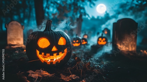 Fototapeta premium Illuminated JackOLantern In Spooky Graveyard Setting