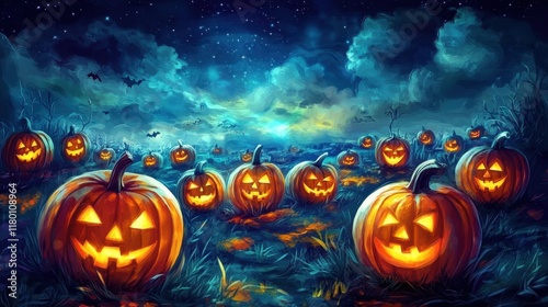 Fototapeta premium Illuminated Jackolanterns in a Spooky Halloween Field