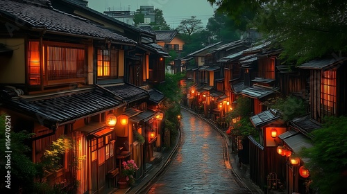 Fototapeta premium Illuminated Japanese Street at Night A Tranquil Evening Scene