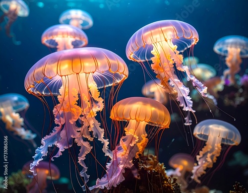 © Jakimen, Naklejka premium Illuminated jellyfish gracefully drift in a dark, underwater scene