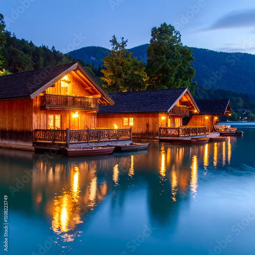 © nrpkitti, Fototapeta premium Illuminated Lakeside Wooden Cabins at Dusk Mountain Scenery Calm Water Reflection