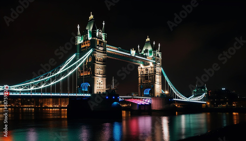 Fototapeta premium Illuminated landmark reflects on water, majestic man made structure generated...