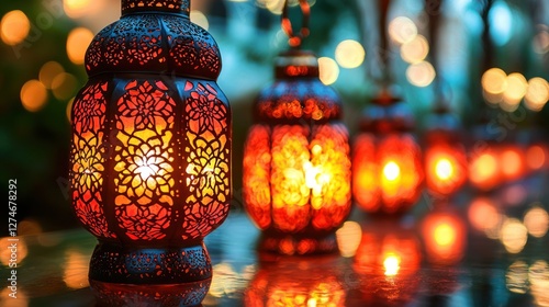 Fototapeta premium Illuminated lanterns at night, festive outdoor setting, warm glow, bokeh background; ideal for holidays