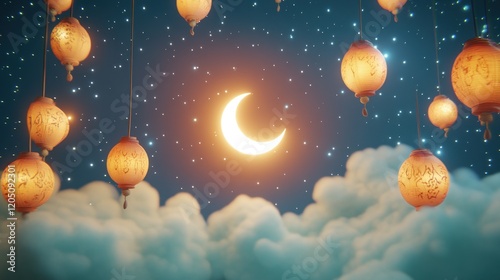 Fototapeta premium Illuminated Lanterns Hanging Above Clouds Under Crescent Moon