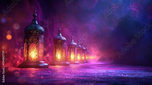 Fototapeta premium Illuminated Lanterns Line Mystical Purple Haze Scene