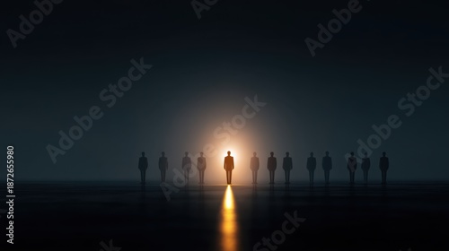 © 69, Naklejka premium Illuminated Leader Surrounded by Shadows in a Corporate Scene with Dramatic Lighting and Soft Focus Background