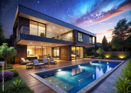 © DigitalArt Max, Obraz premium Illuminated luxury modern house at night with sparkling outdoor swimming pool surrounded by lush greenery and sleek patio furniture under a starry sky.