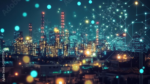 Fototapeta premium Illuminated Metropolis: A Night View of a Smart City's Industrial Heart