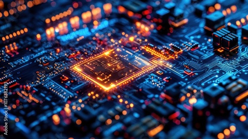 Fototapeta premium Illuminated Microchip Circuit Board with Glowing Orange Lines