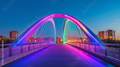 Obraz premium Illuminated Modern Bridge at Dusk Cityscape Rainbow Lights Urban Architecture