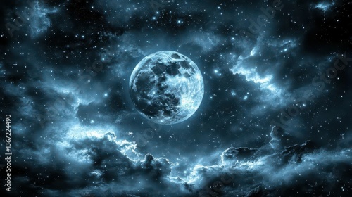 © Pixel, Obraz premium Illuminated Moon Surrounded by Dark Clouds and Stars in a Mystical Night Sky