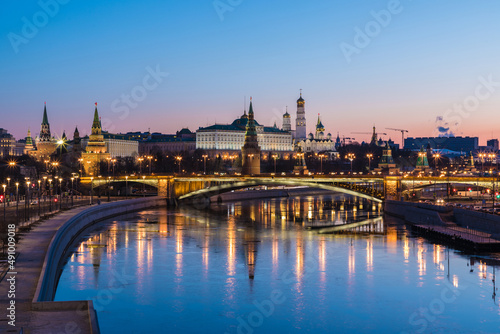 © Майджи Владимир, Fototapeta premium Illuminated Moscow Kremlin and Bolshoy Kamenny Bridge in the night. View from the Patriarshy pedestrian Bridge in Russia. Evening urban landscape in the blue hour