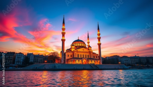 © ekalaila, Fototapeta premium Illuminated Mosque at Sunset Over Water Cityscape