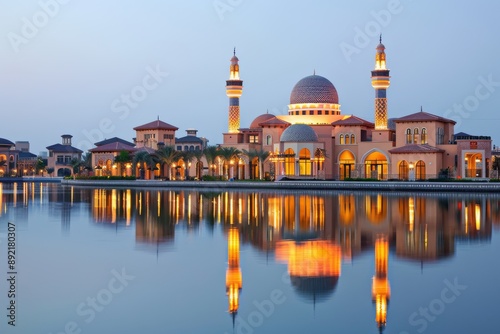 © Fitry, Fototapeta premium Illuminated Mosque with Reflecting Pool at Dusk