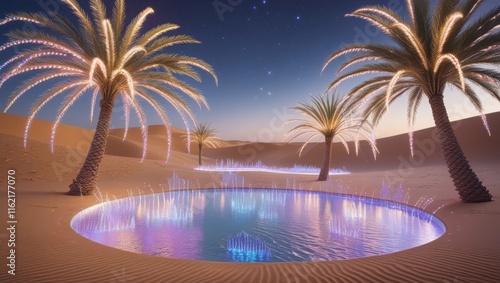 Naklejka premium Illuminated Oasis Pool Amidst Desert Palm Trees