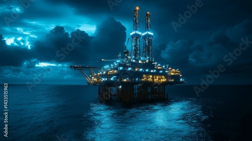 Fototapeta premium Illuminated offshore oil rig at night, under a dramatic sky.
