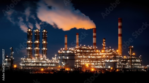 Fototapeta premium Illuminated oil refinery at night industrial landscape city skyline urban...