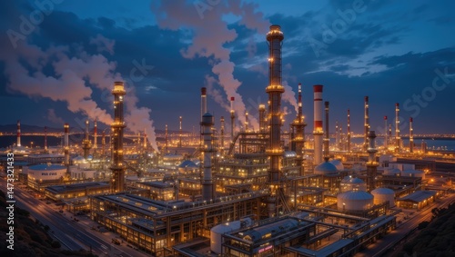 Naklejka premium Illuminated Oil Refinery at Night with Smokestacks Against a Dramatic Sky in Urban Setting