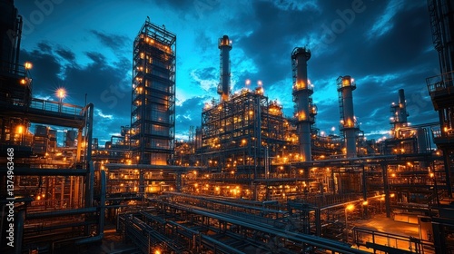 © Yeti, Obraz premium Illuminated oil refinery complex at twilight