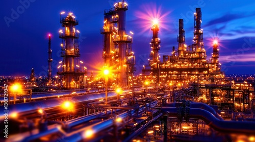 © ADD PHOTO, Fototapeta premium Illuminated Oil Refinery Complex Glowing in the Nighttime Cityscape with Intricate Pipeline Network and Towering Structures against the Urban Skyline