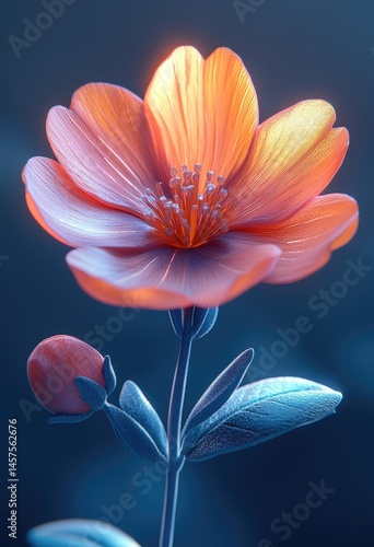 Fototapeta premium Illuminated orange flower, close-up, dark background, botanical art, nature