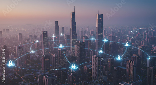© nanang, Fototapeta premium Illuminated Padlock Network Connecting Skyscrapers in a Modern Cityscape at Dusk