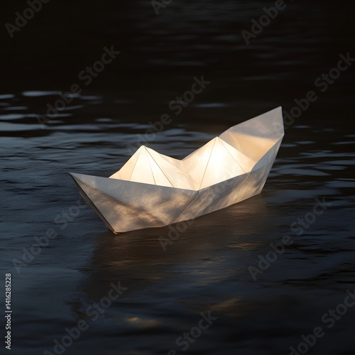 © doaibu, Obraz premium Illuminated paper boat on dark water