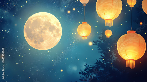 © Thiago, Fototapeta premium Illuminated paper lanterns floating under full moon at mid-autumn festival. Celestial Moonlit Sky. Illustration