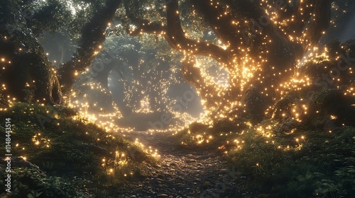 © Raffaza, Fototapeta premium Illuminated path through forest.