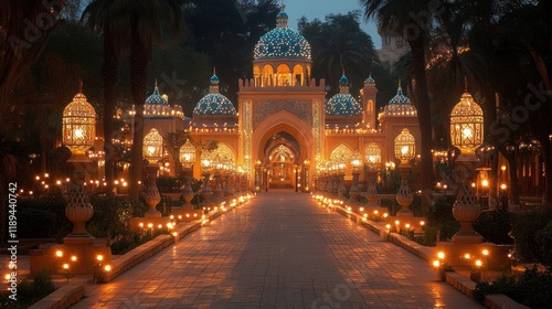 © Creative_art, Fototapeta premium Illuminated Pathway to Ornate Pavilion at Dusk in Lush Garden Setting