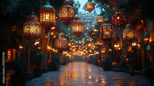 © Achaa, Obraz premium Illuminated Pathway With Intricate Hanging Lanterns