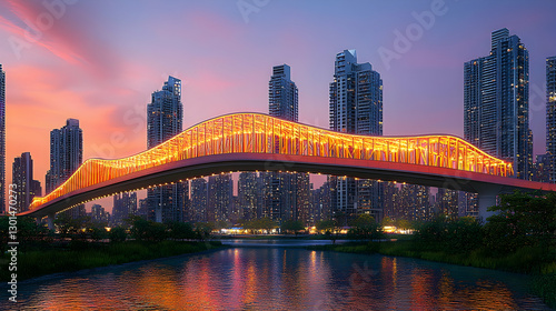 © indasah, Fototapeta premium Illuminated Pedestrian Bridge Over River at Sunset