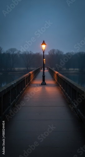 © Ariestia, Fototapeta premium Illuminated pedestrian walkway extends into a misty, dark natural setting at dusk