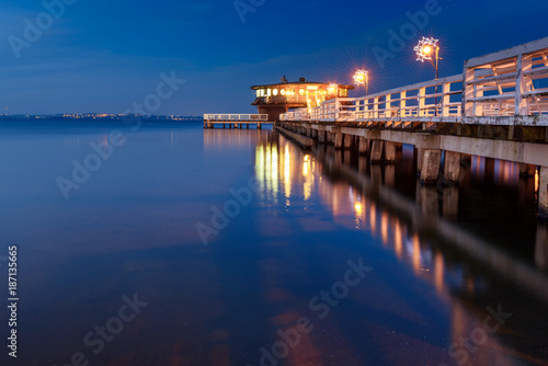 © vivoo, Fototapeta premium Illuminated pier in Puck at night. Baltic Sea, Poland.
