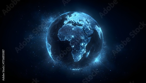 Obraz premium Illuminated planet earth glowing with blue energy and cosmic dust swirling...