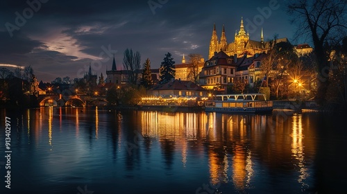 © Ahmad-Muslimin, Obraz premium Illuminated Prague Castle and Charles Bridge at Night with Boat on Vltava River