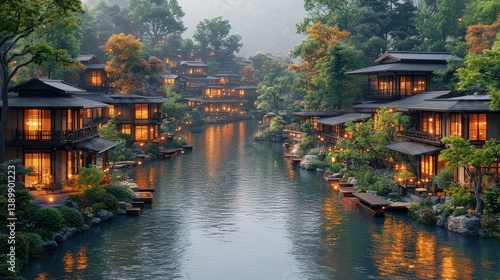 © Nonot, Obraz premium Illuminated River Village with Misty Dawn.