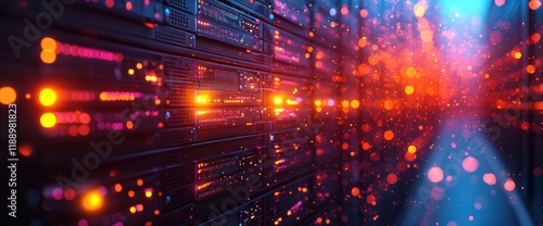© Design By Reiga, Fototapeta premium Illuminated server rack with glowing lights.