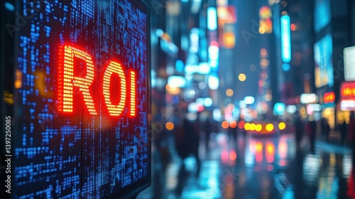 Fototapeta premium Illuminated Sign in Cityscape Displaying ROI Metrics at Night with Vibrant Neon Lights Reflected on Wet Pavement