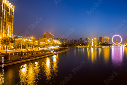 © zhu difeng, Fototapeta premium Illuminated skyline and cityscape at riverbank