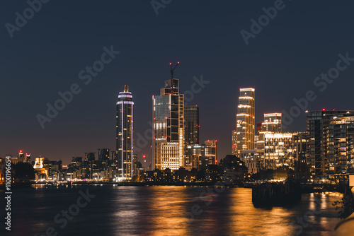 © O.Kobyliatskyi, Fototapeta premium Illuminated skyscrapers in the London skyline at night reflecting on the Thames River
