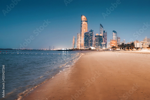 © EdNurg, Naklejka premium Illuminated skyscrapers of Abu Dhabi reflecting on the wet sand of the beach at dusk, creating a vibrant, tranquil cityscape by the sea