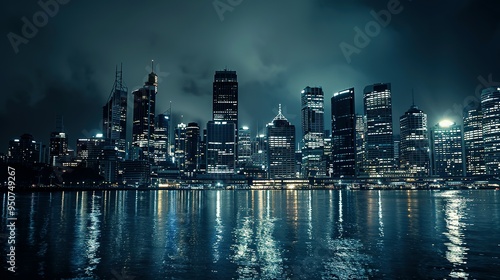 © Putri, Fototapeta premium Illuminated Skyscrapers Reflecting in Calm Waters at Night
