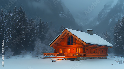 Fototapeta premium Illuminated snowy mountain cabin, winter landscape, tranquil scene, vacation rental