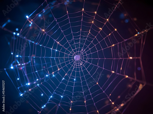 Obraz premium Illuminated Spiderweb: A spiderweb glows with ethereal blue and purple light,...