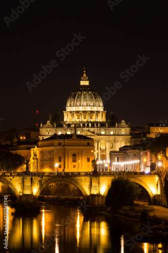 © Tobias, Fototapeta premium Illuminated St. Peter's Basilica and reflections in the Tiber River after sunset in Rome, Italy